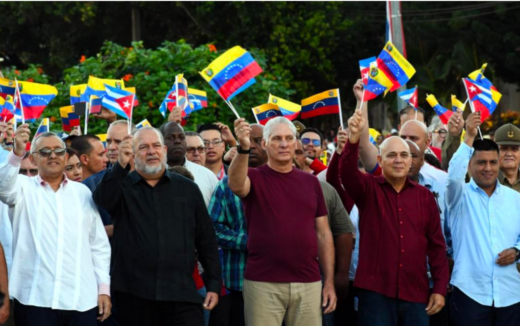 10月17日,5万多古巴民众聚集在首都哈瓦那总统大道的西蒙·玻利瓦尔雕像前,抗议美国军事威胁委内瑞拉,表达对委内瑞拉人民和政府的坚定支持。古共中央第一书记、古巴国家主席迪亚斯-卡内尔(前左三)等古巴党政领导人以及委内瑞拉全国代表大会第一副主席佩德罗·因方特(前右一)出席集会 图:新华社