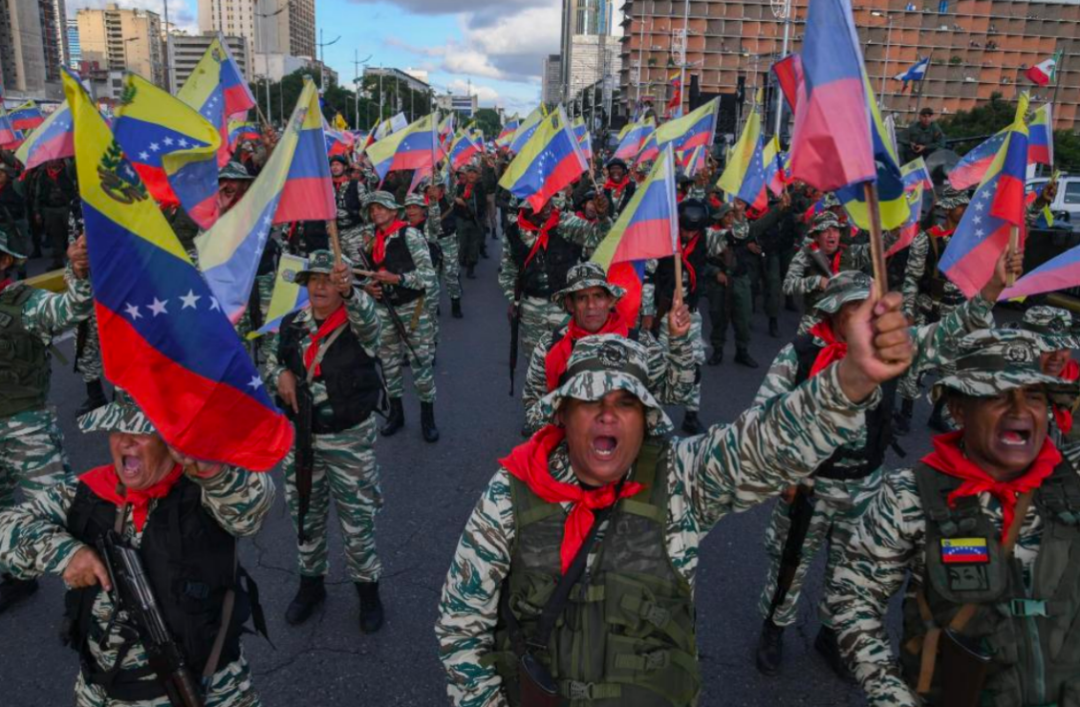 9月23日,在委内瑞拉首都加拉加斯,民兵组织成员挥舞委内瑞拉国旗参加游行 图:新华社