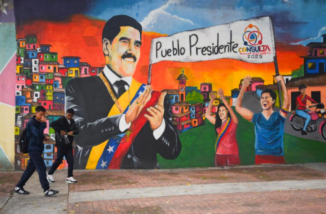 9月22日,在委内瑞拉首都加拉加斯,行人从街头支持马杜罗总统的宣传标语前走过 图:新华社